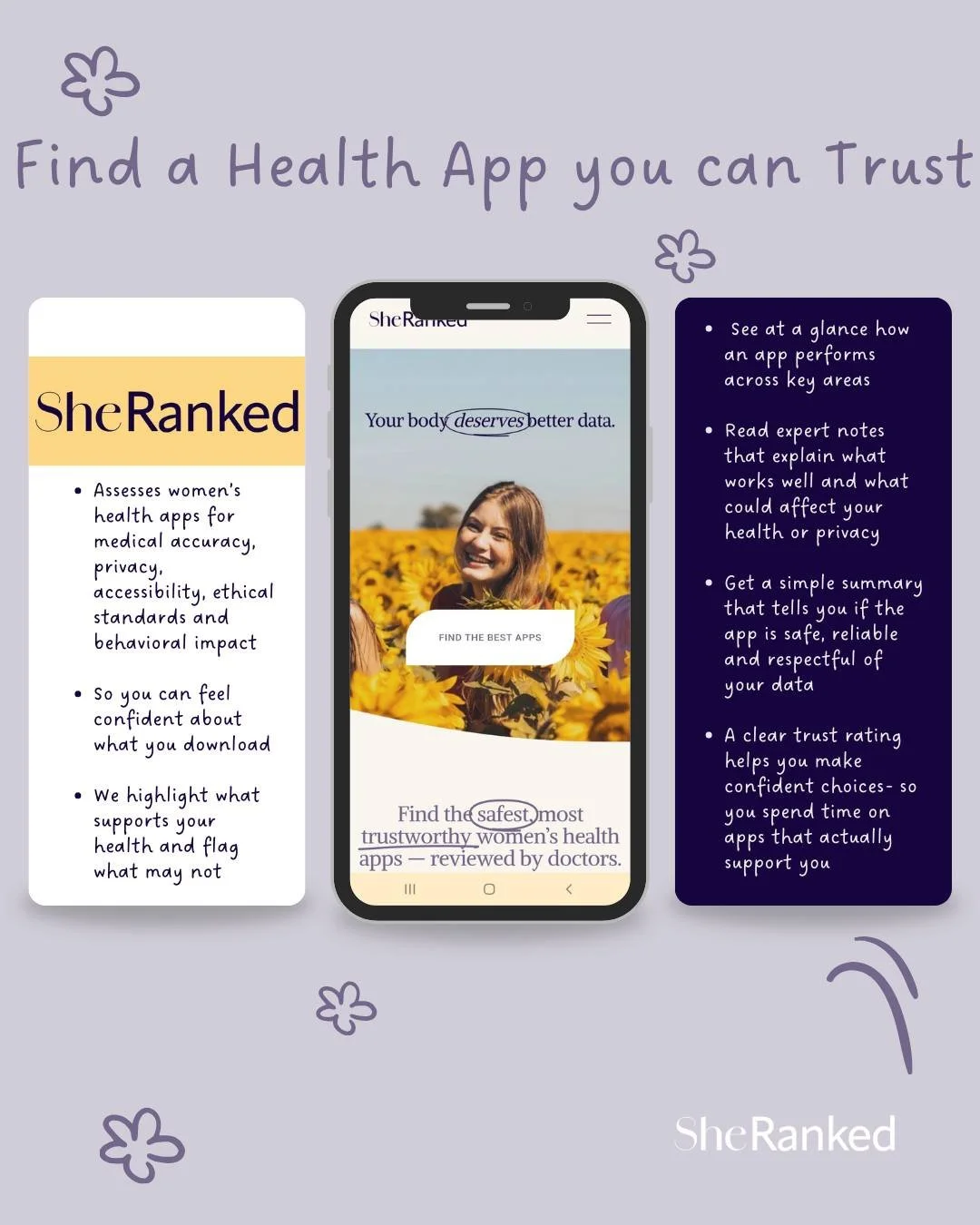 SheRanked helps you find safe, trusted health apps — made by women doctors and developers.